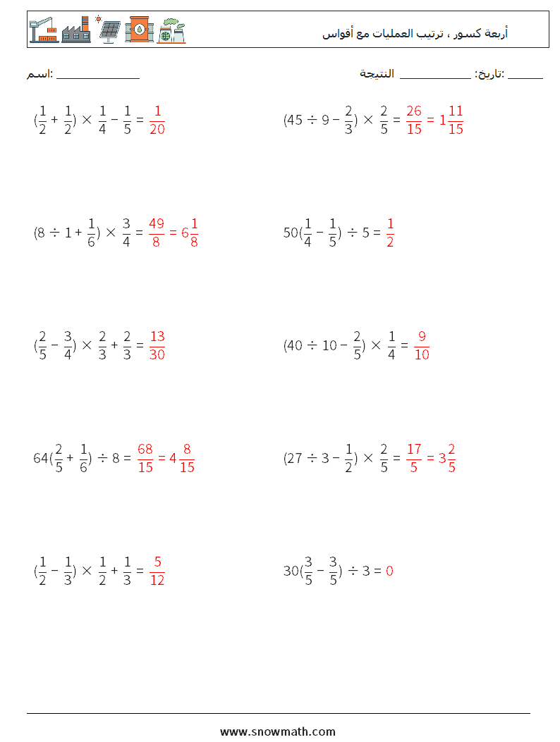 (10) أربعة كسور ، ترتيب العمليات مع أقواس