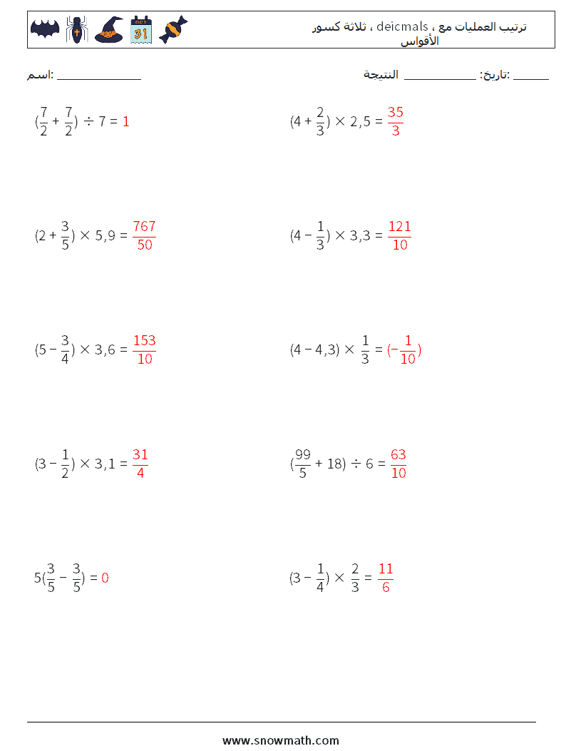 (10) ثلاثة كسور ، deicmals ، ترتيب العمليات مع الأقواس