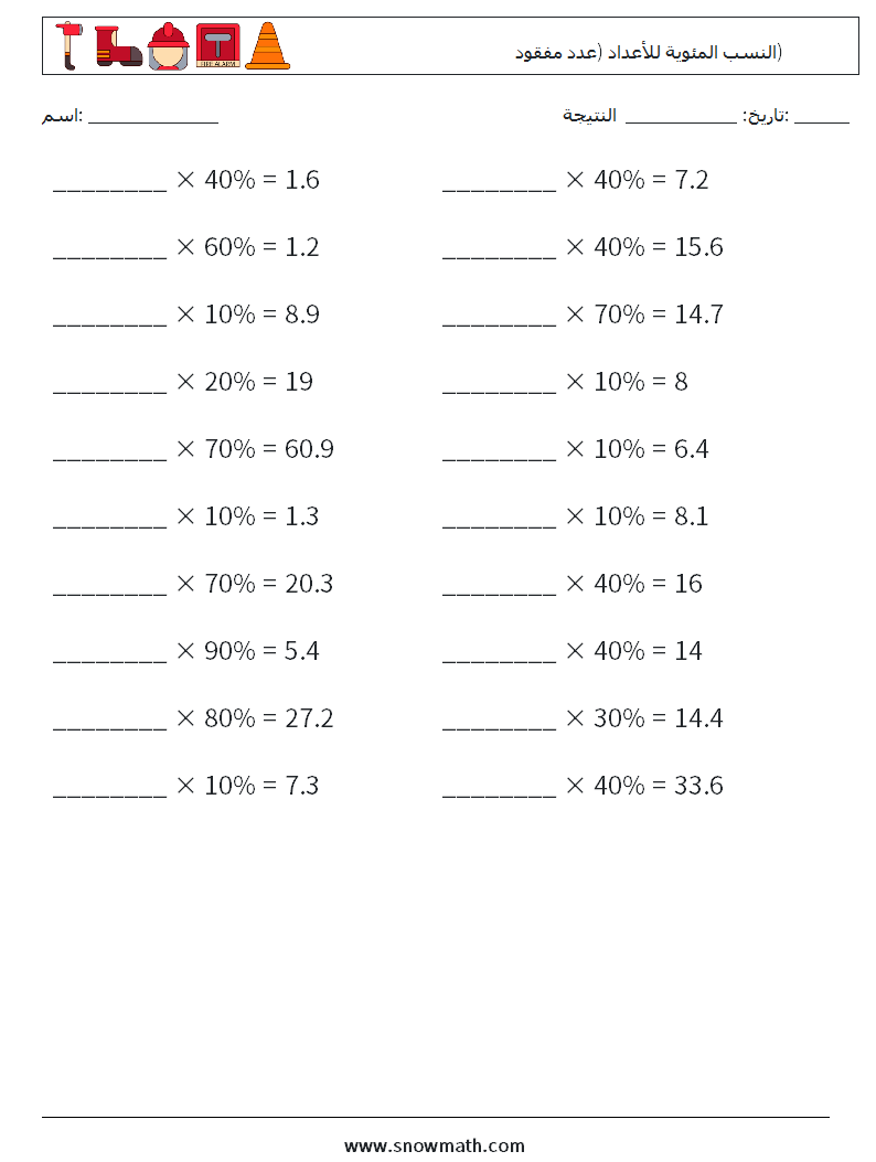 النسب المئوية للأعداد (عدد مفقود) أوراق عمل الرياضيات 1