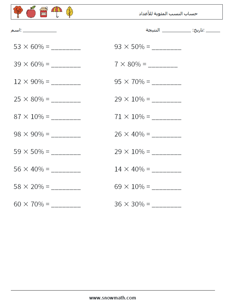 حساب النسب المئوية للأعداد أوراق عمل الرياضيات 1
