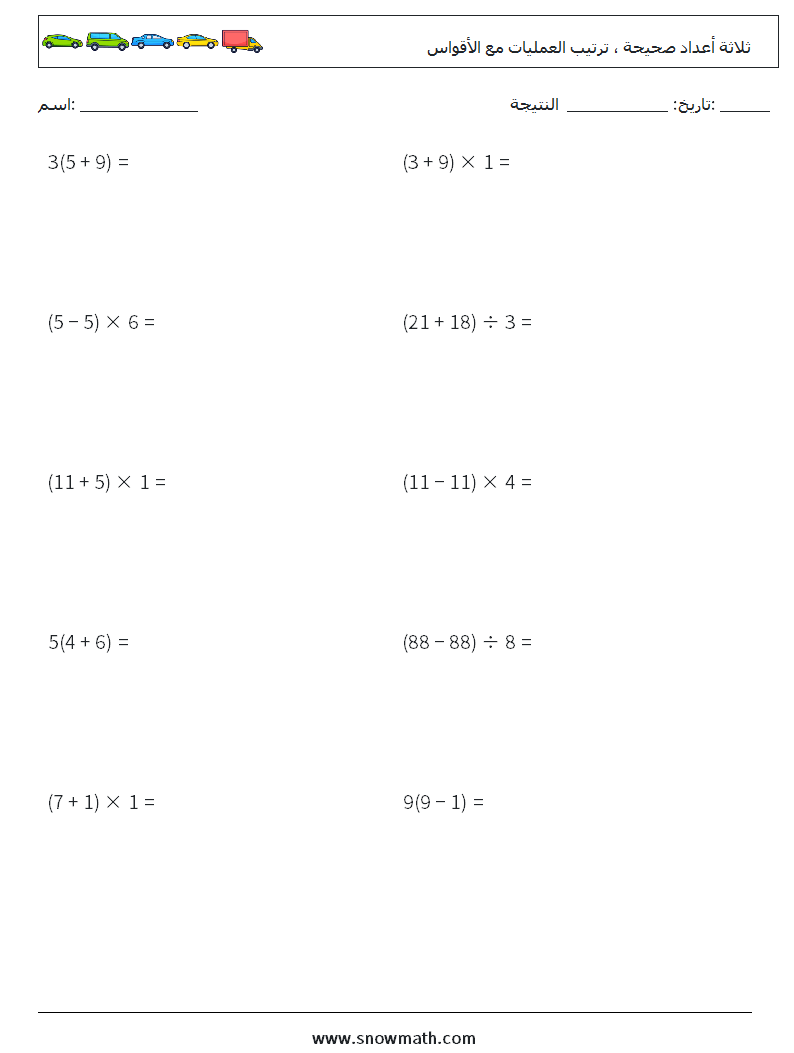 (10) ثلاثة أعداد صحيحة ، ترتيب العمليات مع الأقواس أوراق عمل الرياضيات 9