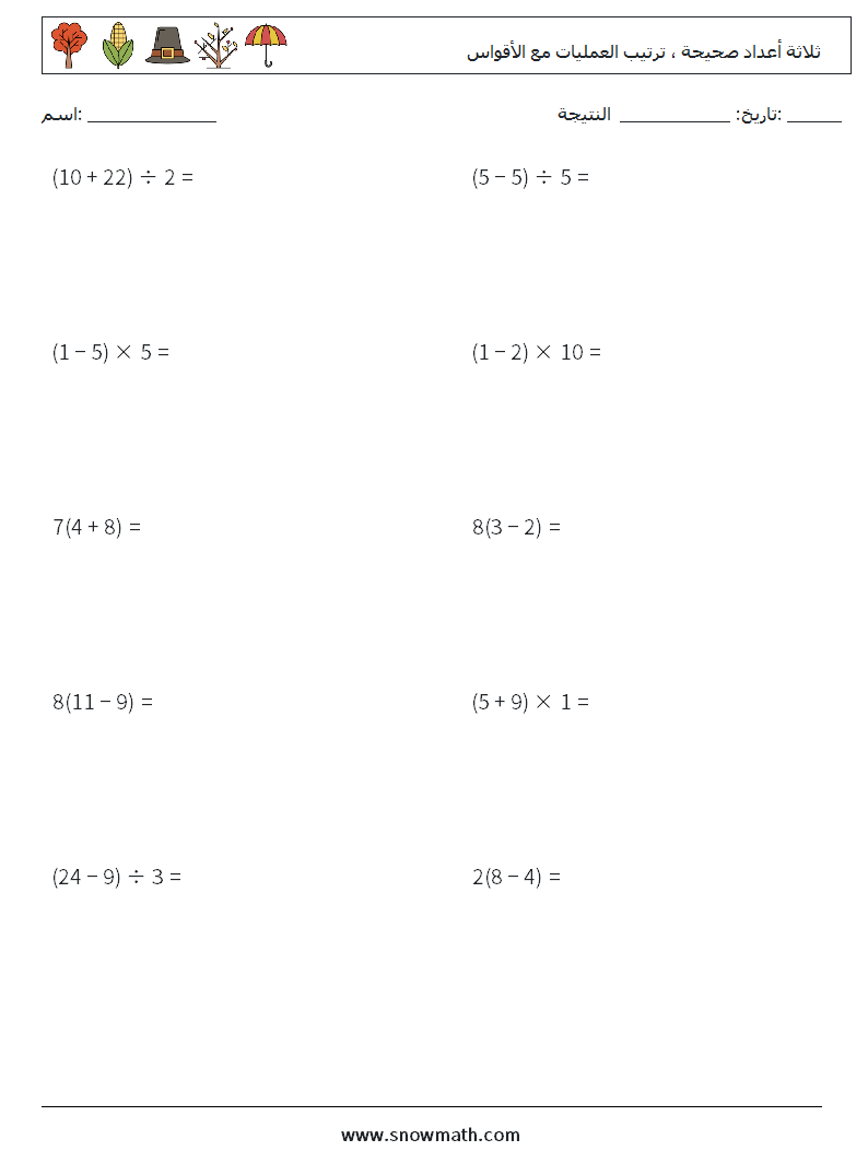 (10) ثلاثة أعداد صحيحة ، ترتيب العمليات مع الأقواس أوراق عمل الرياضيات 2