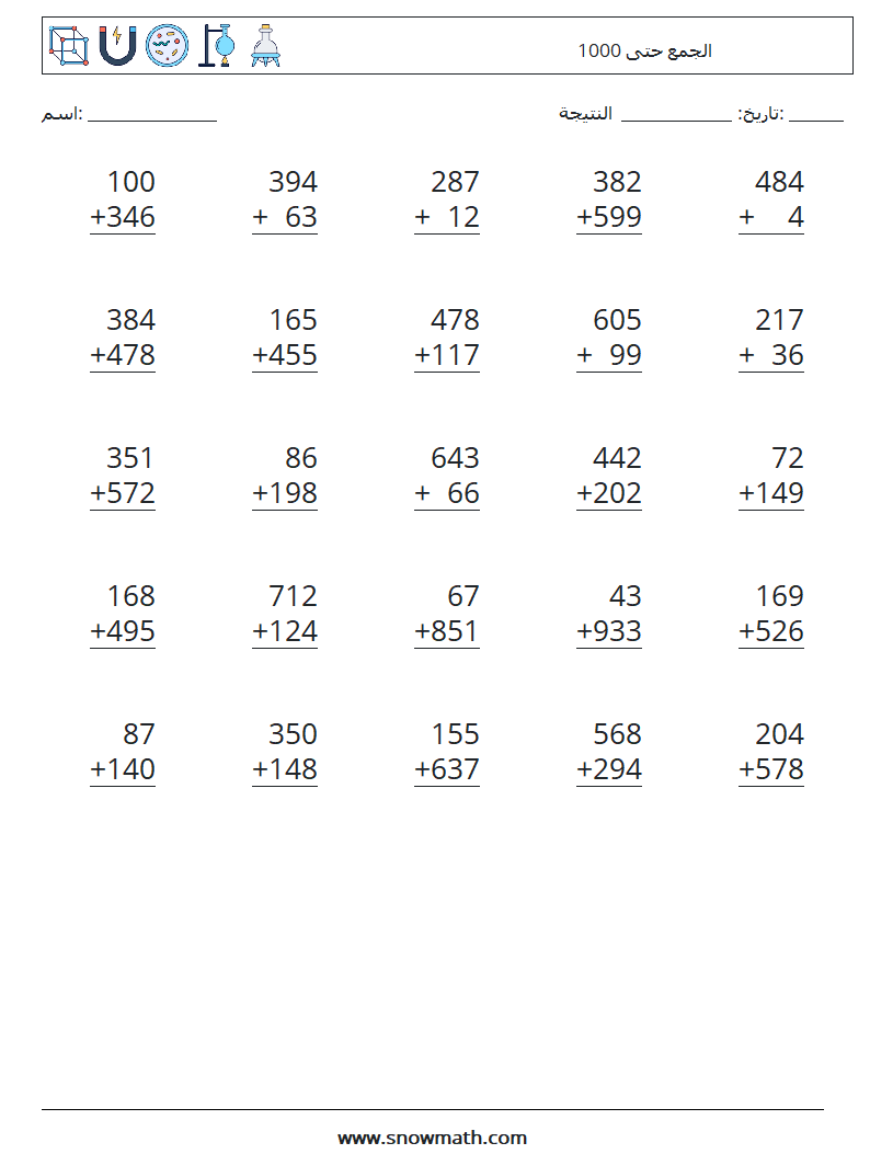 (25) الجمع حتى 1000 أوراق عمل الرياضيات 1