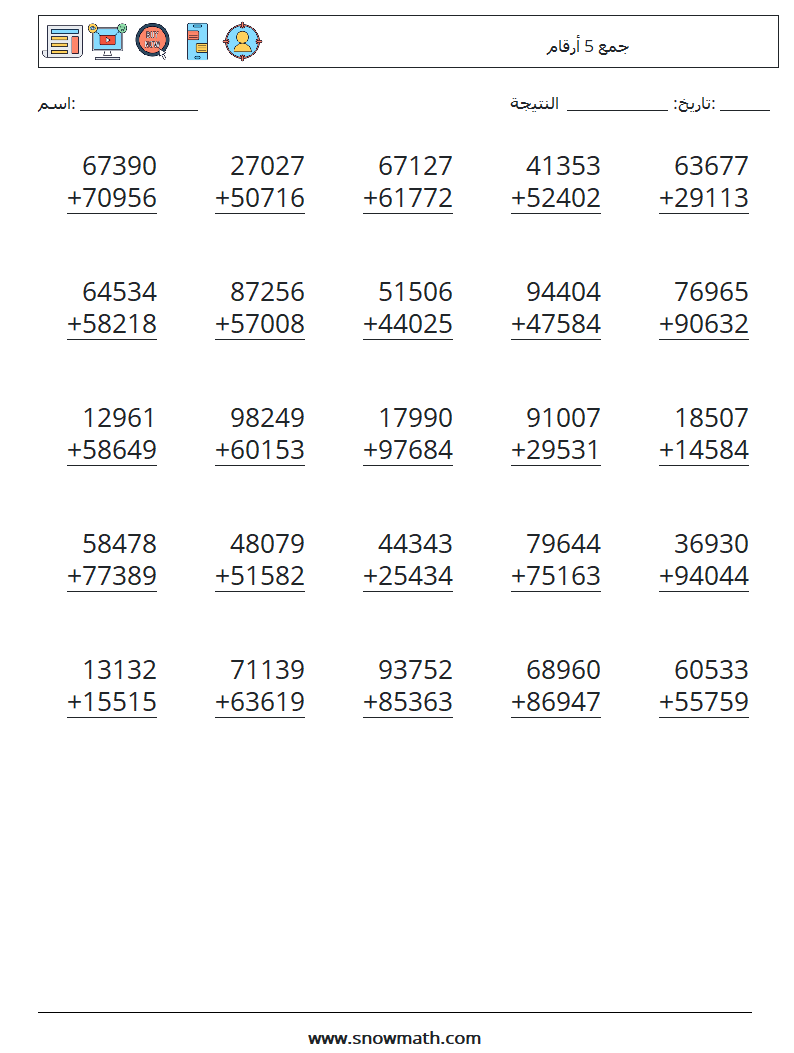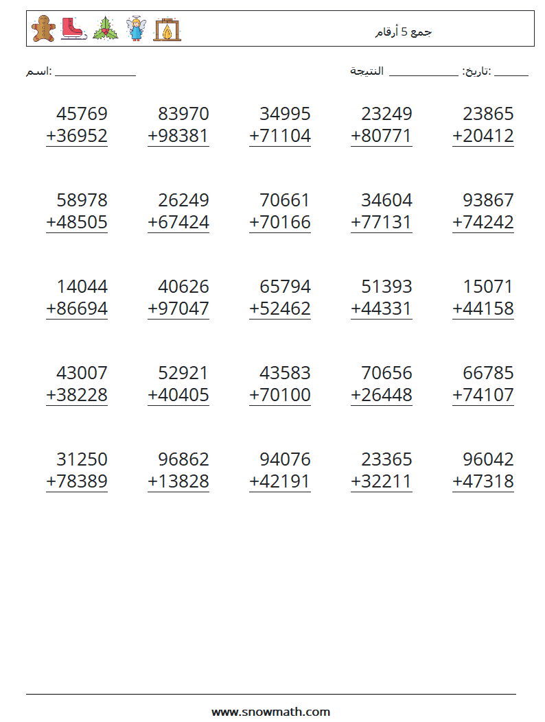 (25 سؤال رياضيات) تعلم الجمع ، إضافة أرقام مكونة من 5 أرقام ، أوراق عمل رياضية قابلة للطباعة.
