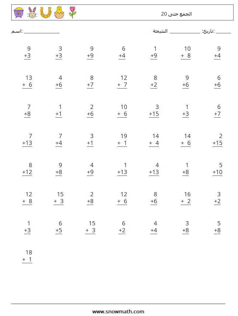 (50) الجمع حتى 20 أوراق عمل الرياضيات 9