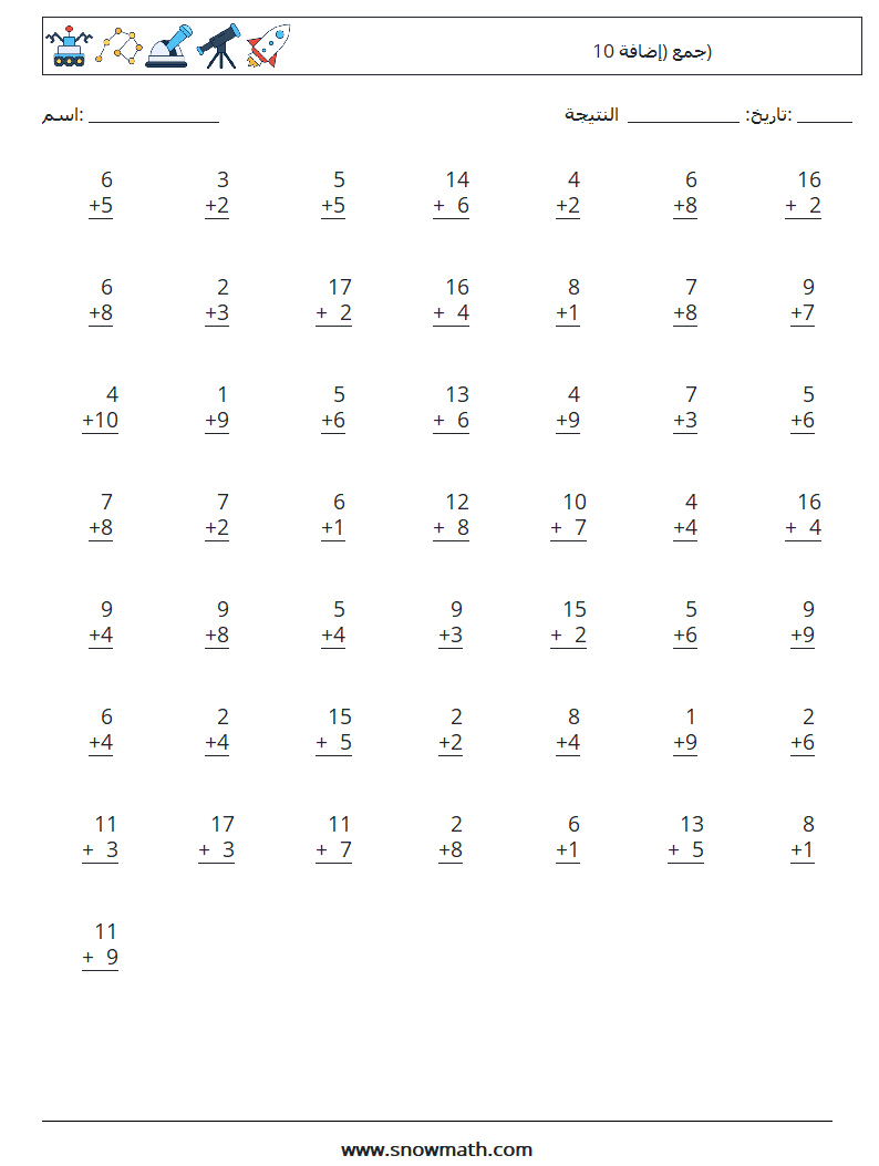 (50 سؤال رياضيات) تدرب على الجمع حتى 20 ، إضافة 10