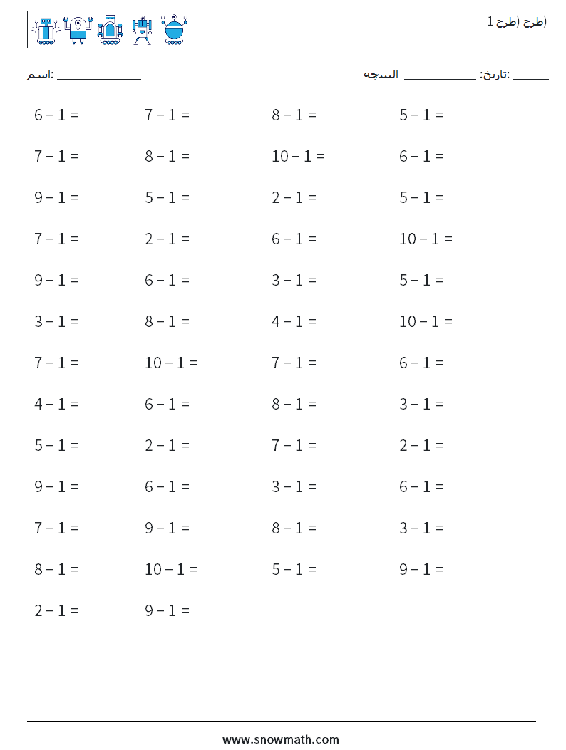 (50 سؤال رياضيات) تدرب على أوراق عمل الطرح ، طرح 1 ، kingergarten math