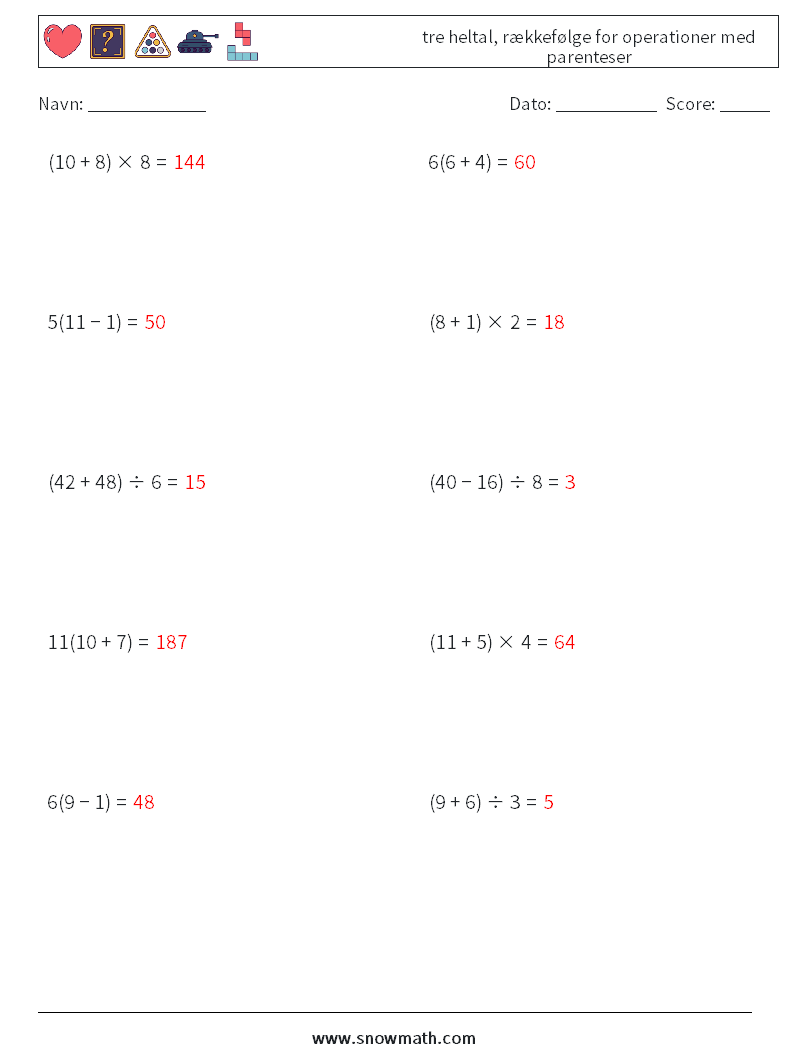 (10) tre heltal, rækkefølge for operationer med parenteser