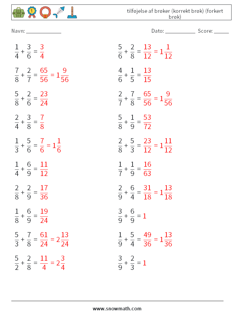 (20) tilføjelse af brøker (korrekt brøk) (forkert brøk)