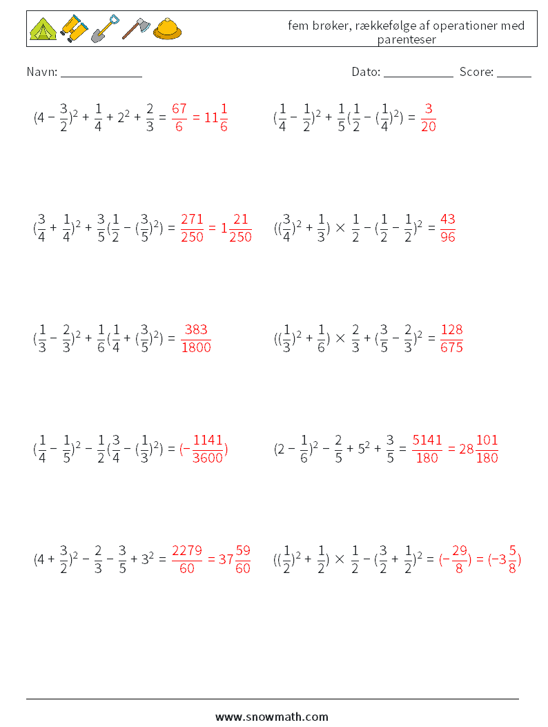 (10) fem brøker, rækkefølge af operationer med parenteser