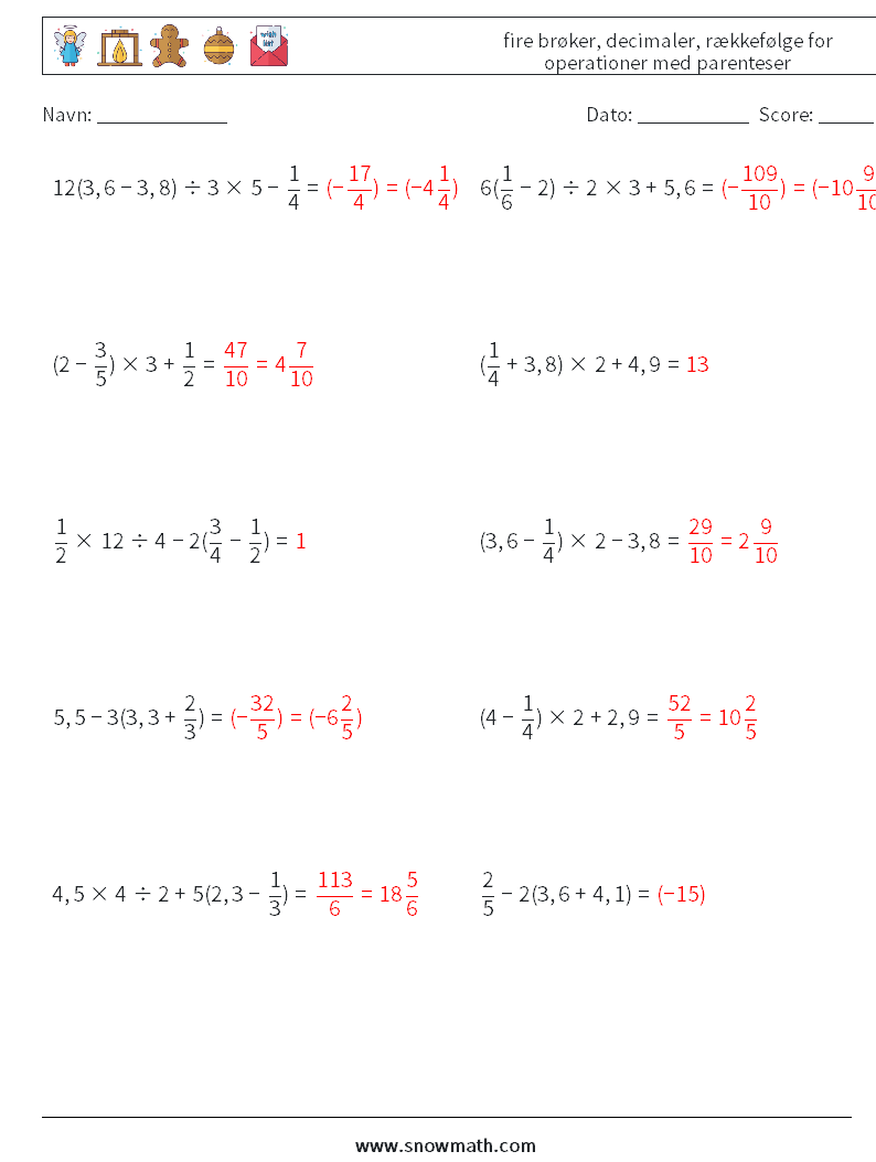 (10) fire brøker, decimaler, rækkefølge for operationer med parenteser