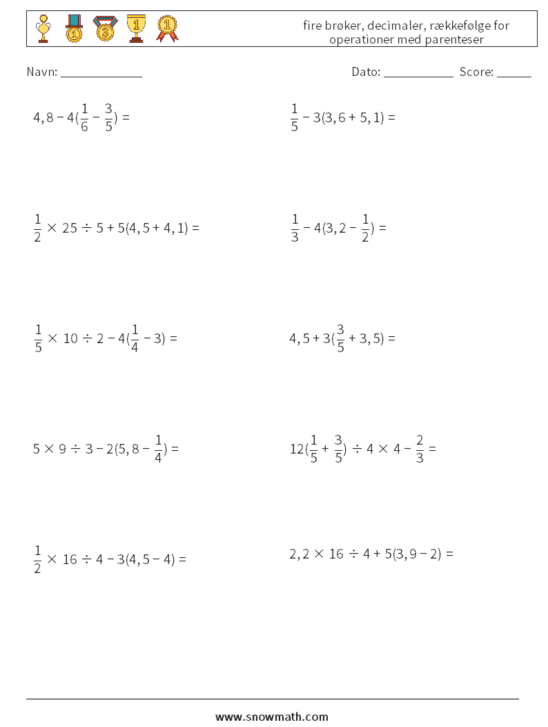 (10) fire brøker, decimaler, rækkefølge for operationer med parenteser Matematiske regneark 12