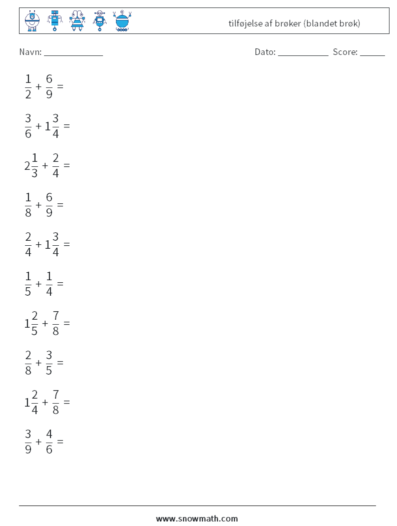 (10) tilføjelse af brøker (blandet brøk) Matematiske regneark 5
