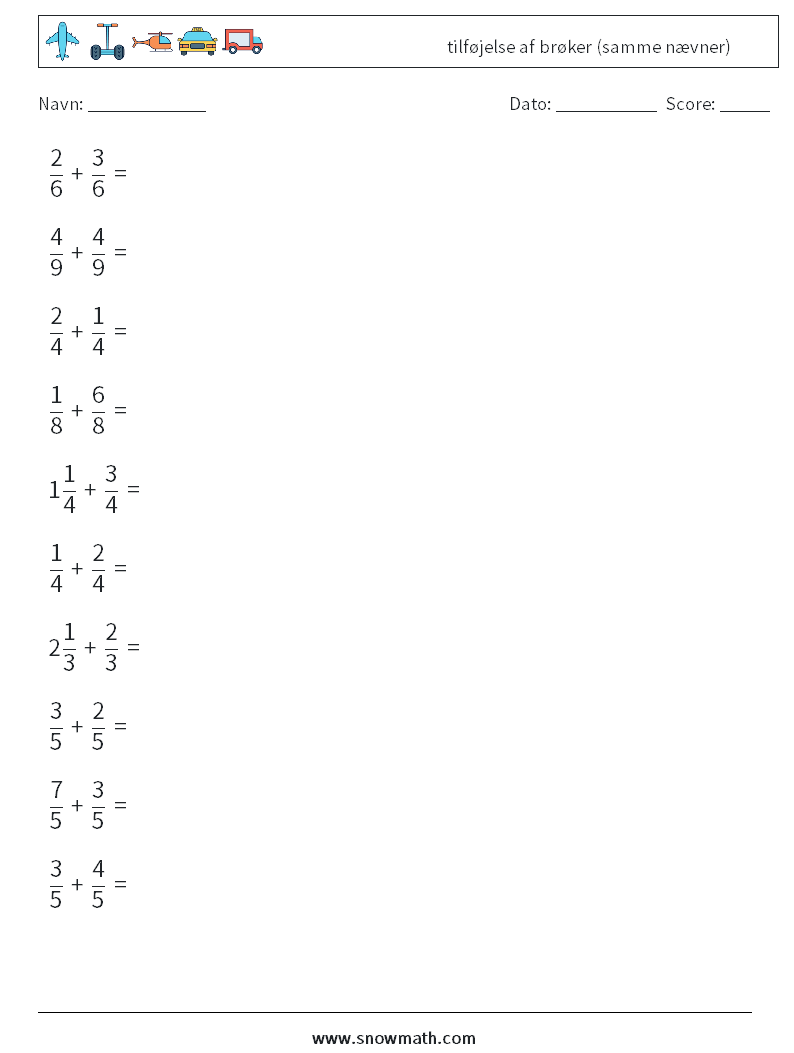 (10) tilføjelse af brøker (samme nævner) Matematiske regneark 1