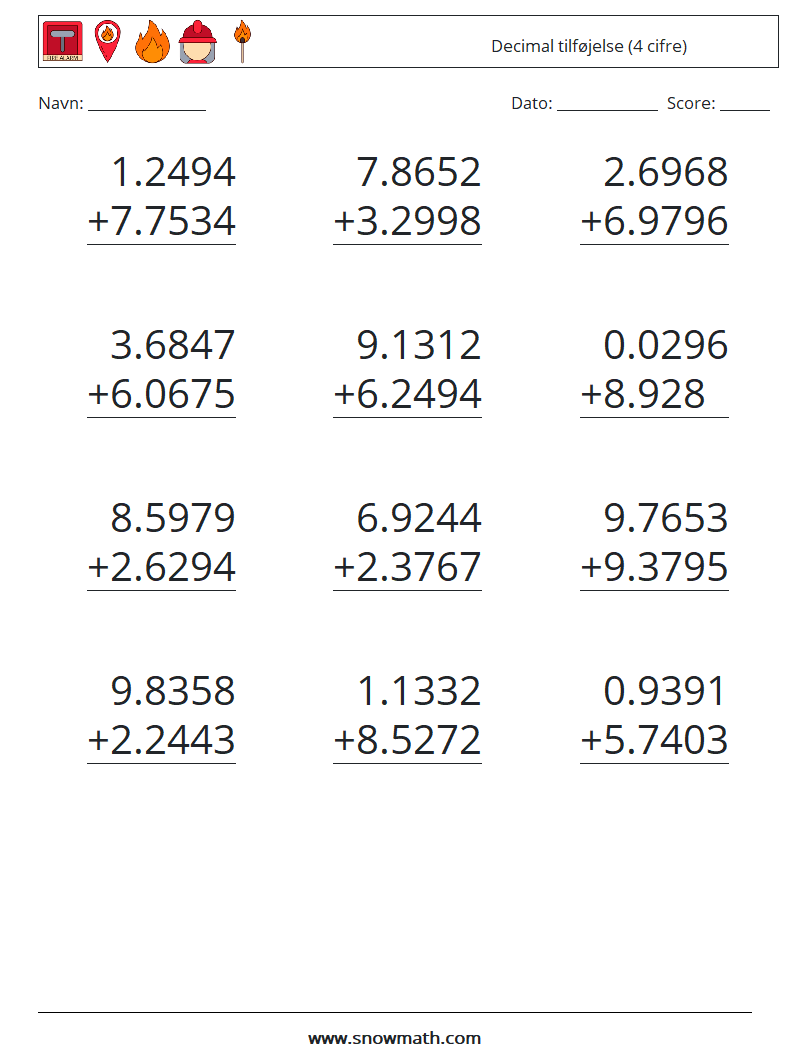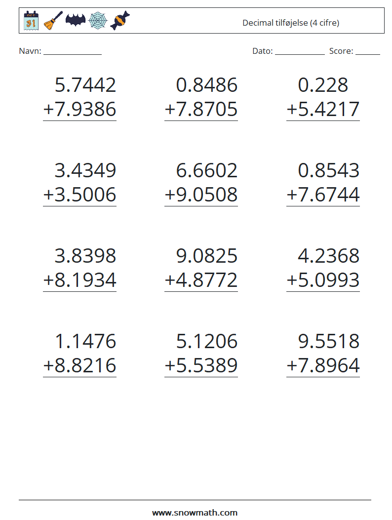 (12) Decimal tilføjelse (4 cifre) Matematiske regneark 12