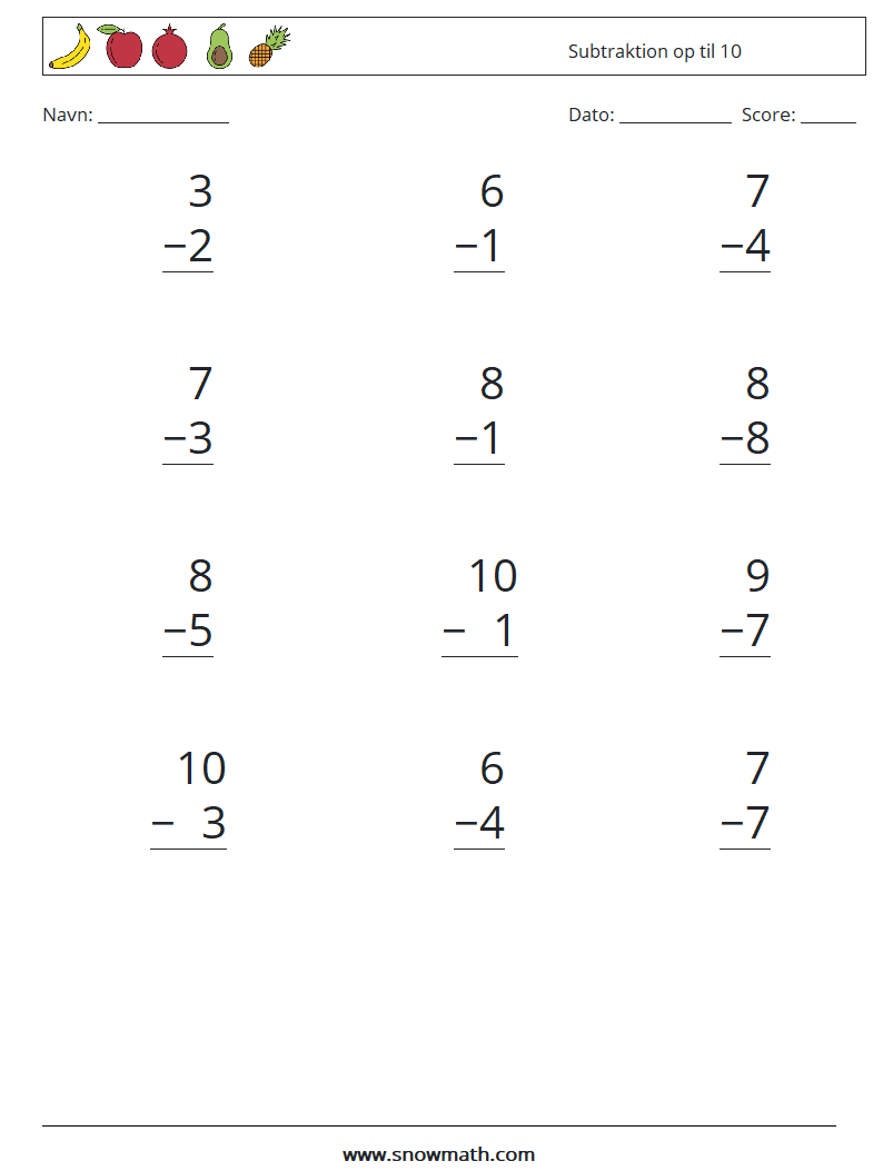 (12 matematiske spørgsmål) Subtraktion op til 10