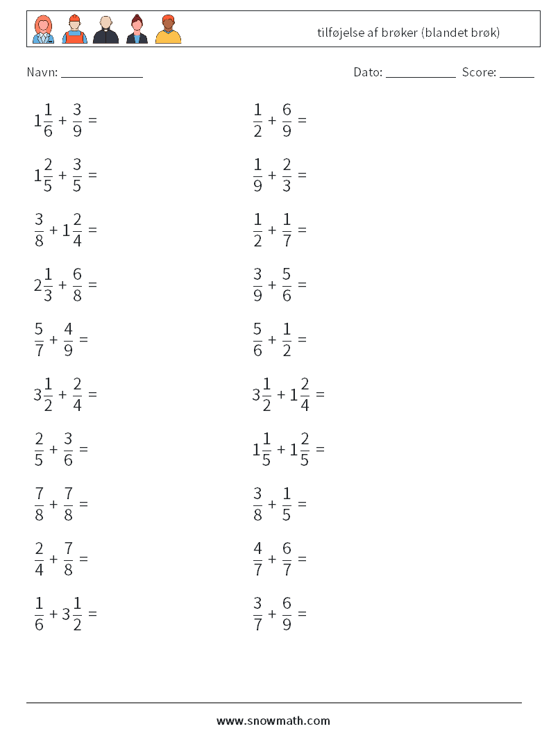 (20) tilføjelse af brøker (blandet brøk) Matematiske regneark 10