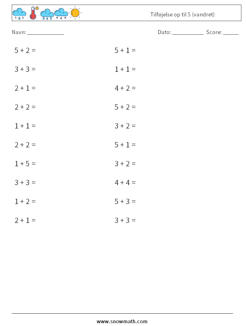 (20 matematiske spørgsmål) Lær matematisk tilføjelse op til 5. pdf matematiske regneark.
