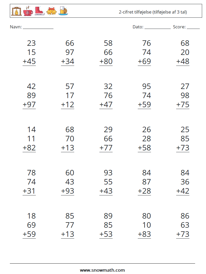 (25) 2-cifret tilføjelse (tilføjelse af 3 tal) Matematiske regneark 14