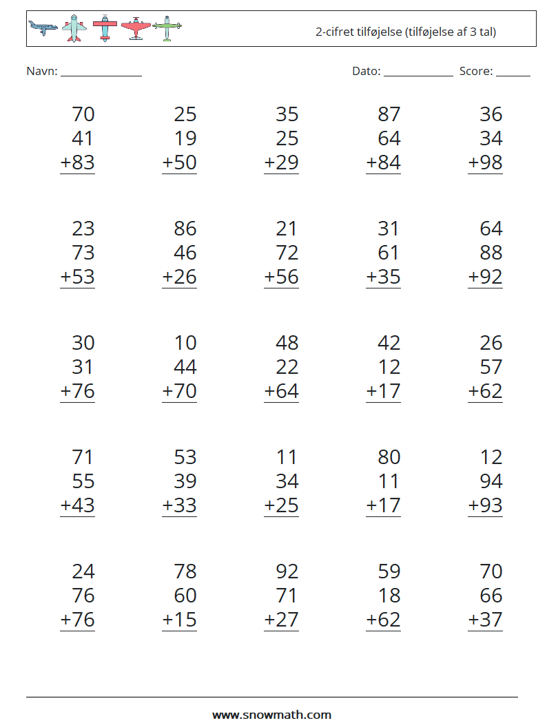 (25) 2-cifret tilføjelse (tilføjelse af 3 tal) Matematiske regneark 18