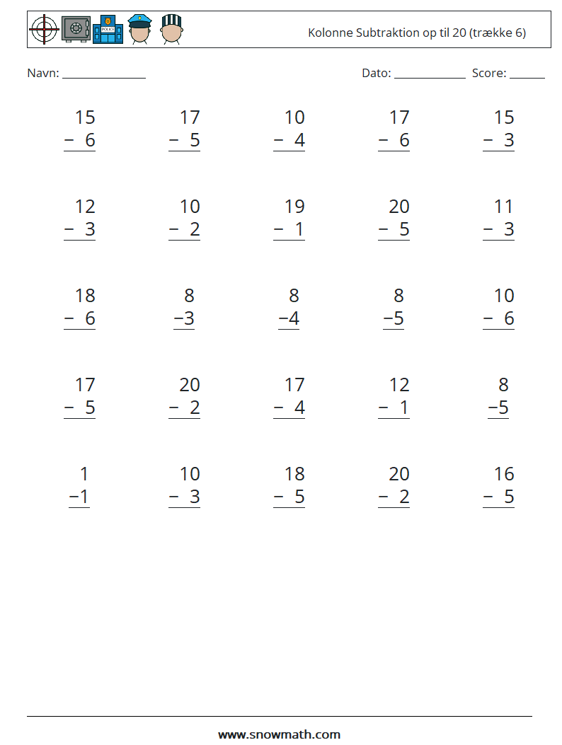 (25) Kolonne Subtraktion op til 20 (trække 6)