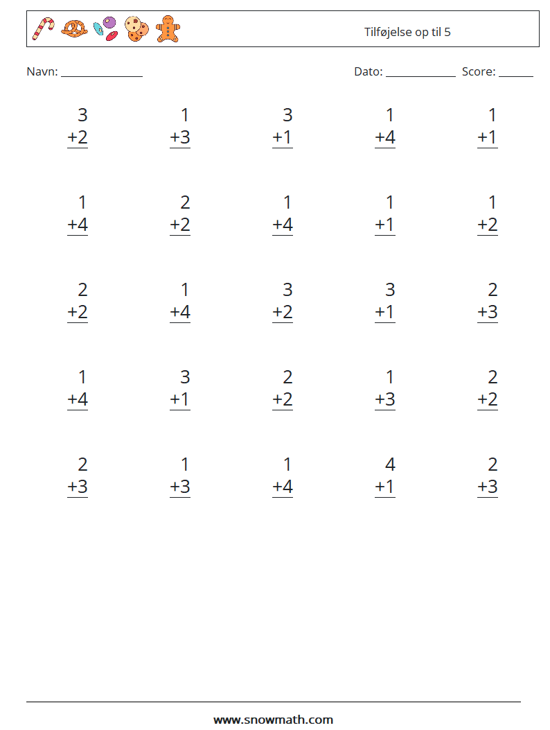 (25) Tilføjelse op til 5 Matematiske regneark 3
