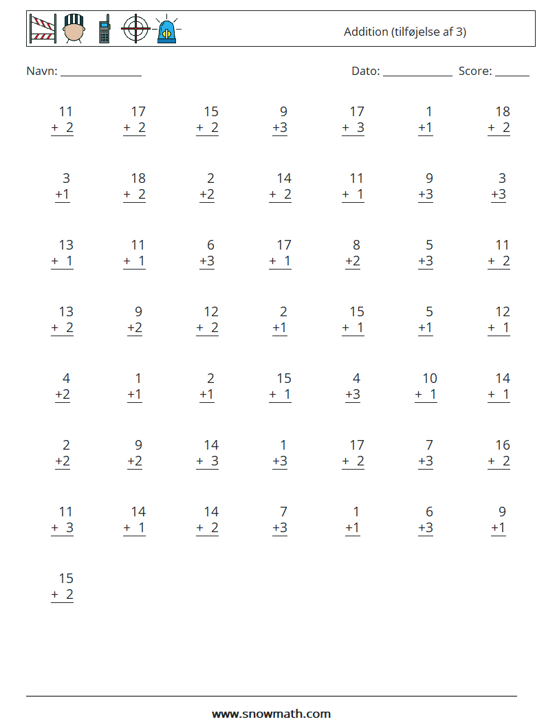 (50) Addition (tilføjelse af 3) Matematiske regneark 3