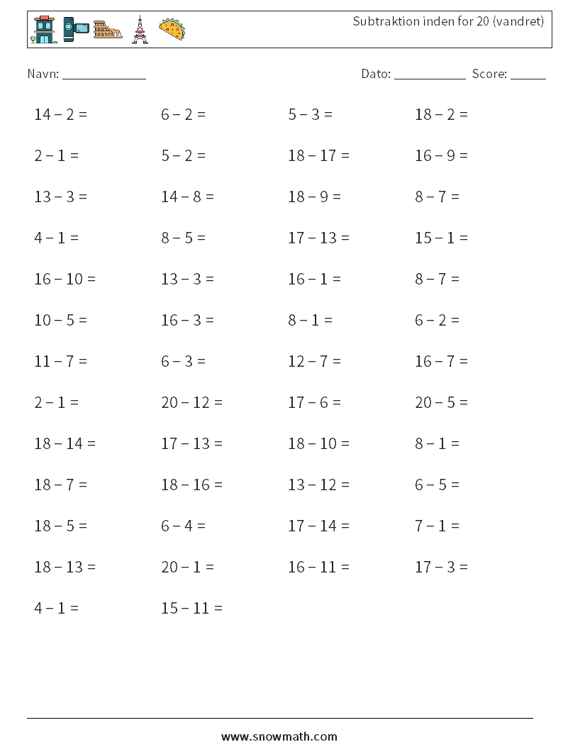 (50 matematiske spørgsmål) Horisontal subtraktion inden for 20