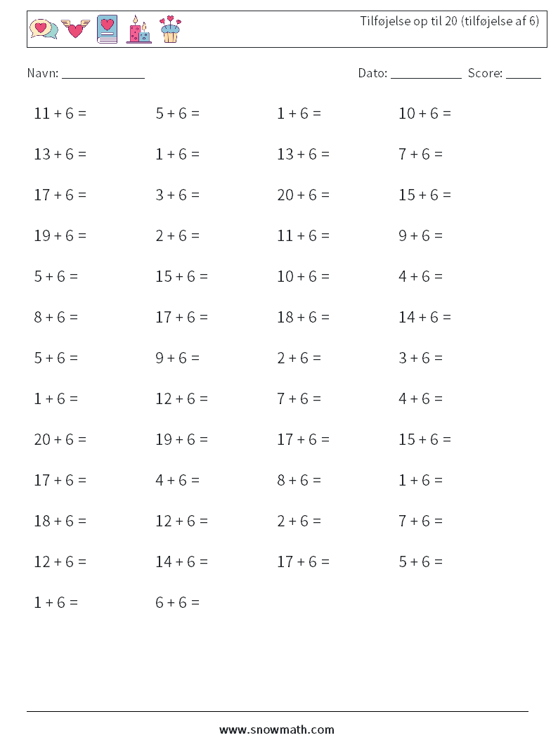 (50) Tilføjelse op til 20 (tilføjelse af 6) Matematiske regneark 6