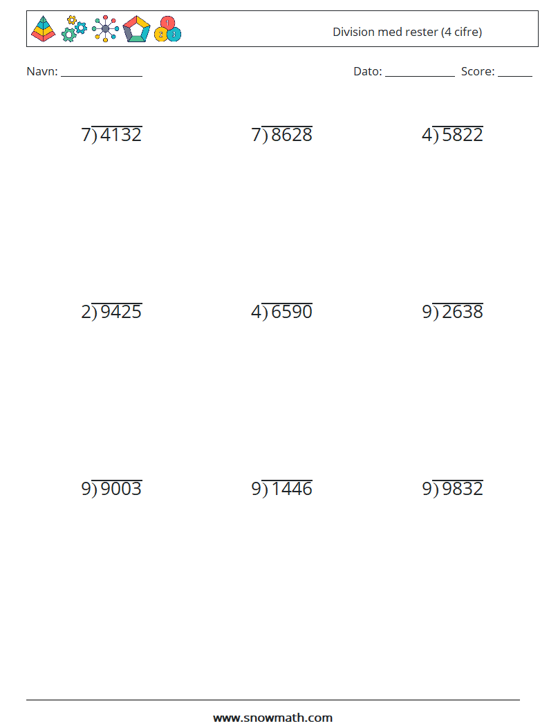 (9) Division med rester (4 cifre) Matematiske regneark 15