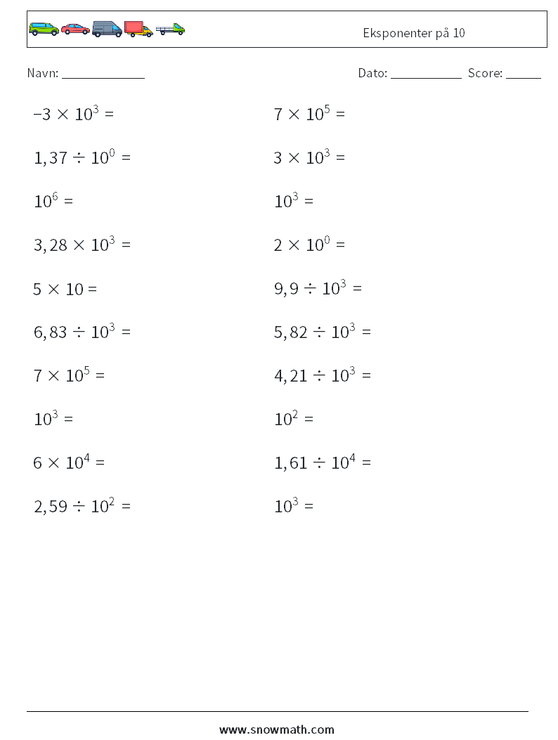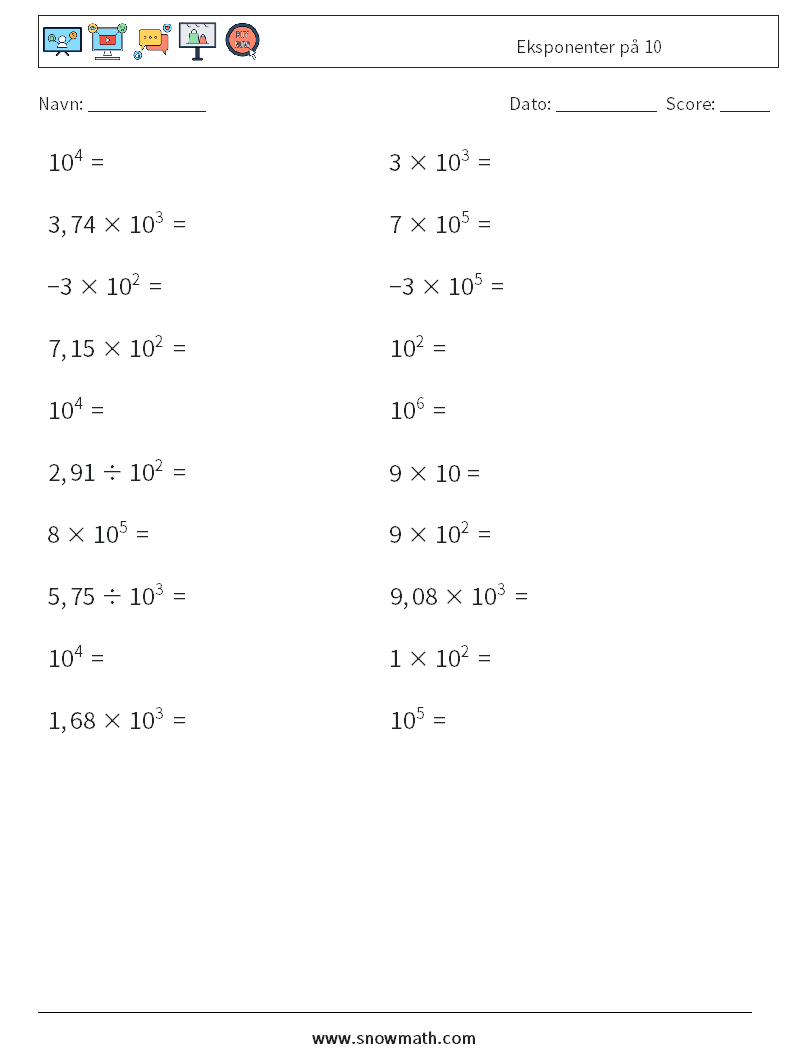 Eksponenter på 10 Matematiske regneark 1