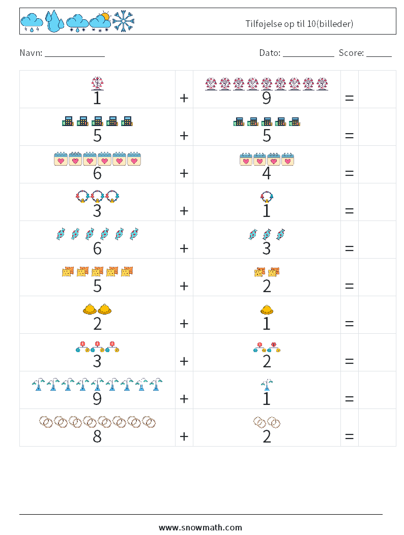 Tilføjelse op til 10(billeder) Matematiske regneark 2