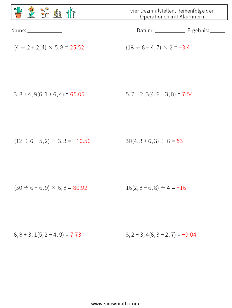 (10) vier Dezimalstellen, Reihenfolge der Operationen mit Klammern