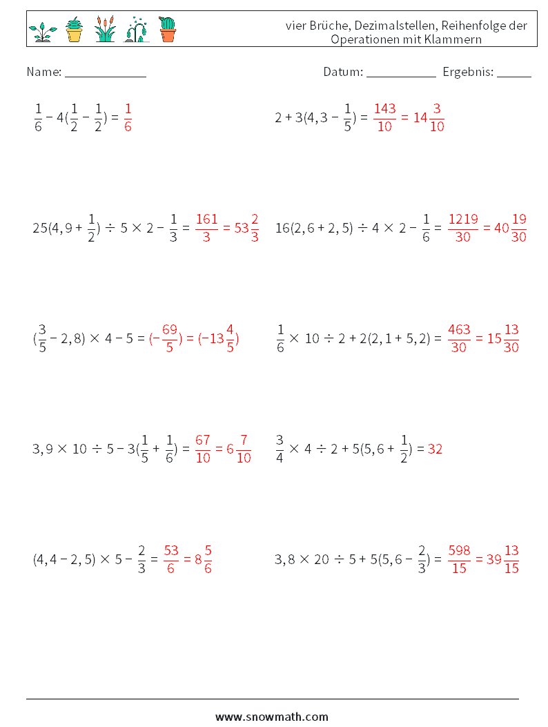 (10) vier Brüche, Dezimalstellen, Reihenfolge der Operationen mit Klammern