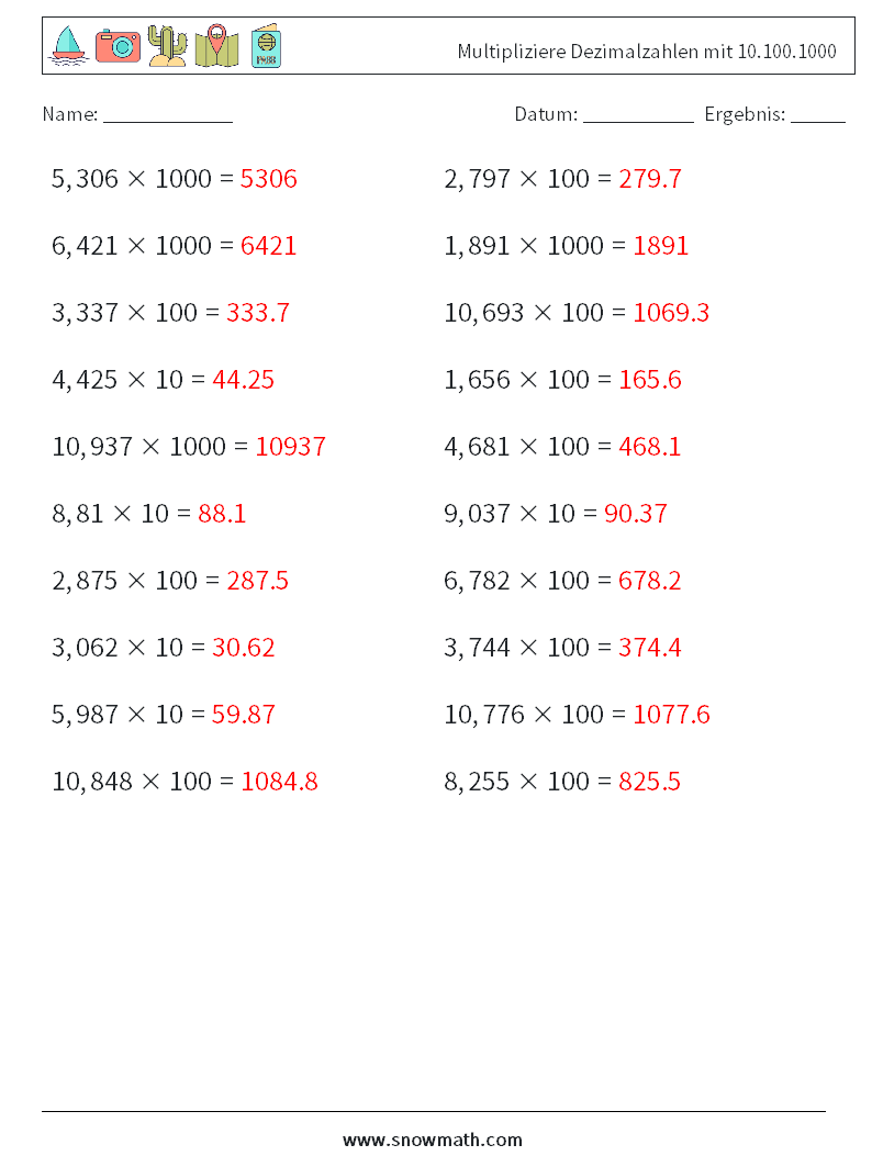 Multipliziere Dezimalzahlen mit 10.100.1000