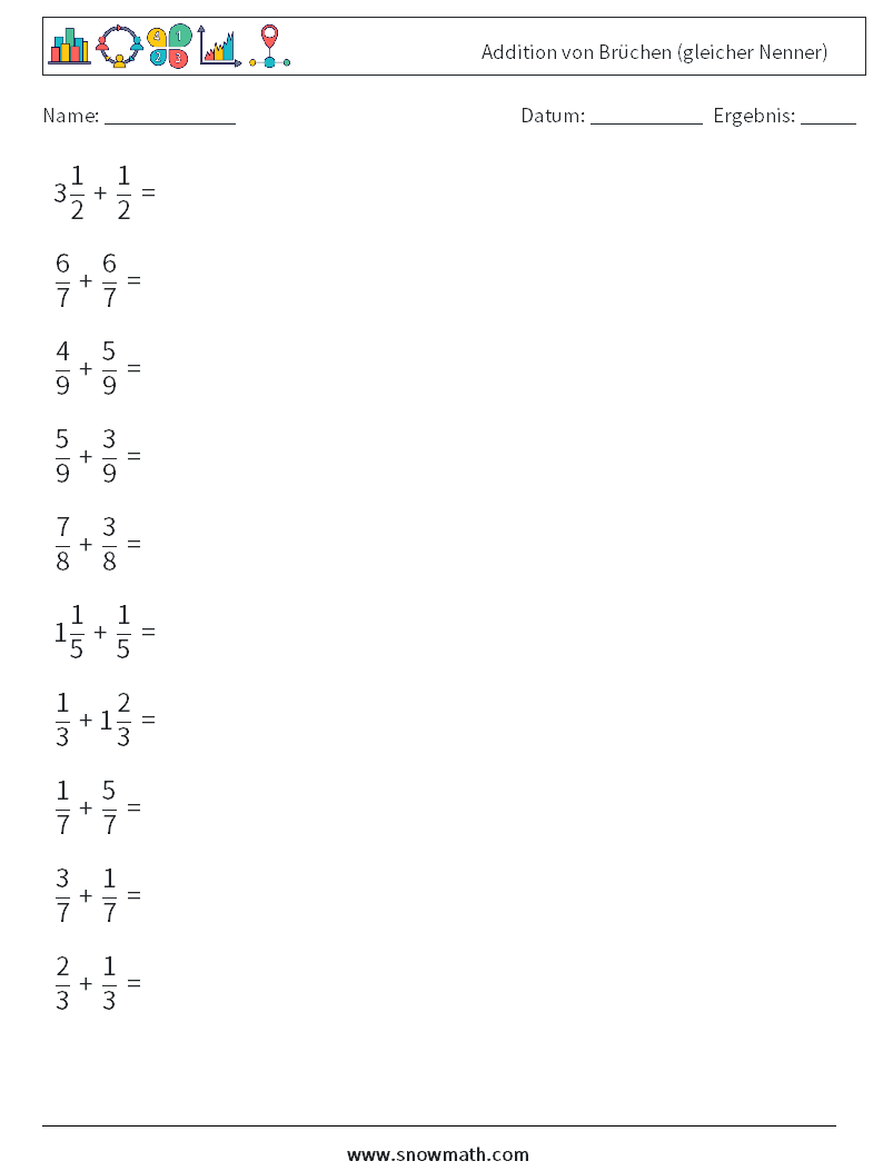 (10) Addition von Brüchen (gleicher Nenner) Mathe-Arbeitsblätter 1