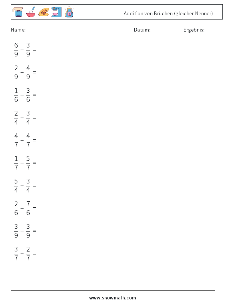(10) Addition von Brüchen (gleicher Nenner) Mathe-Arbeitsblätter 9