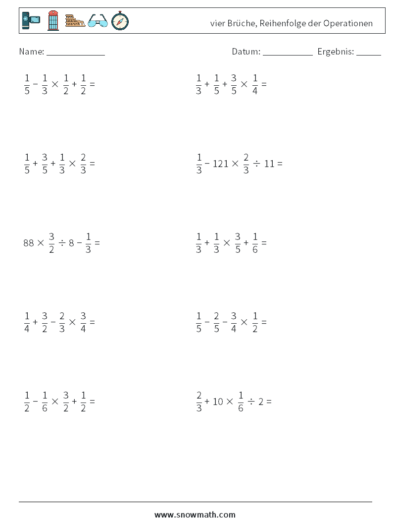 (10) vier Brüche, Reihenfolge der Operationen Mathe-Arbeitsblätter 10