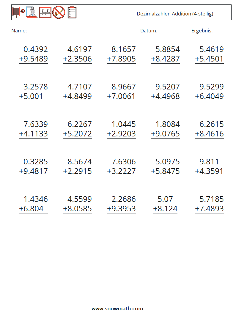 (25) Dezimalzahlen Addition (4-stellig) Mathe-Arbeitsblätter 5
