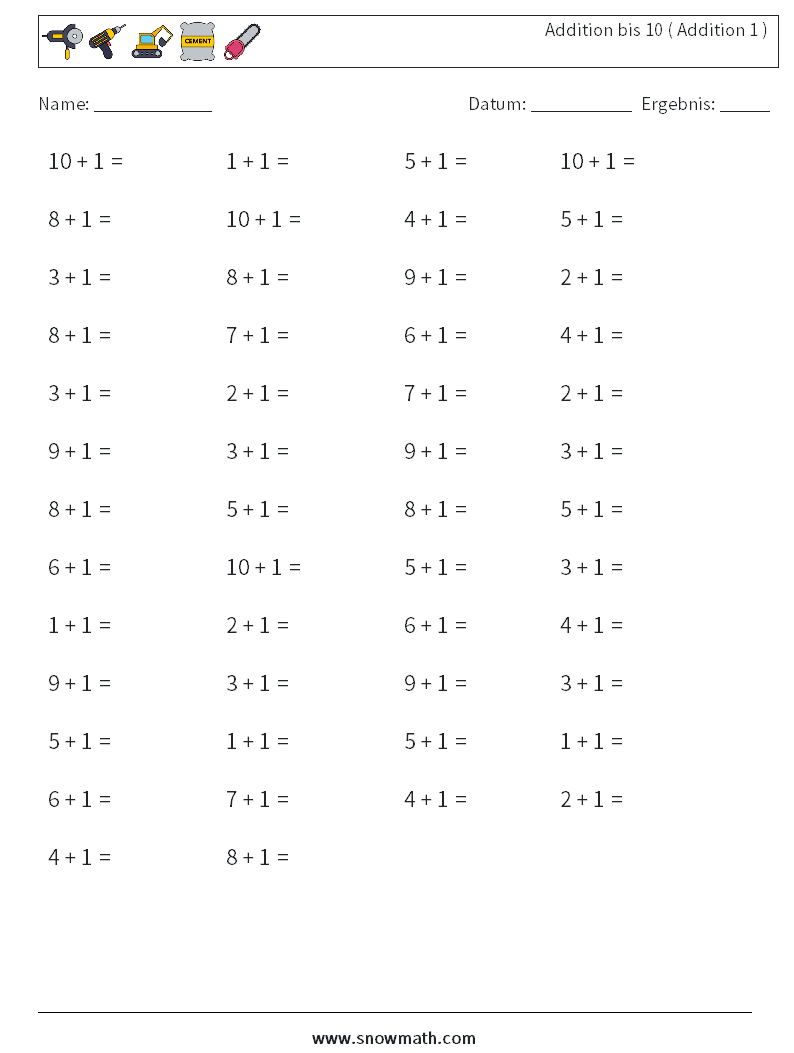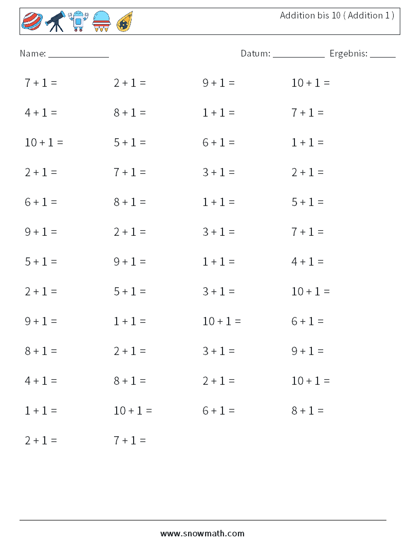 (50 Matheaufgaben) Lernen Sie Kindermathematik, Addition bis 10, Addition 1