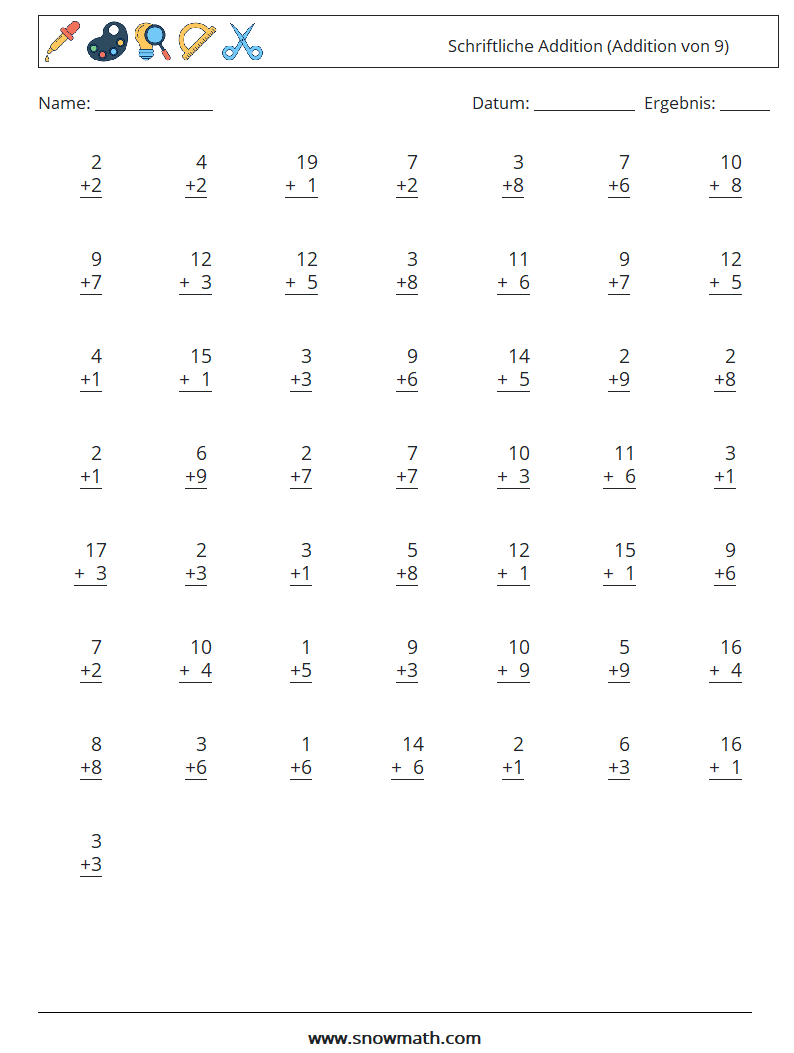 (50) Schriftliche Addition (Addition von 9) Mathe-Arbeitsblätter 10