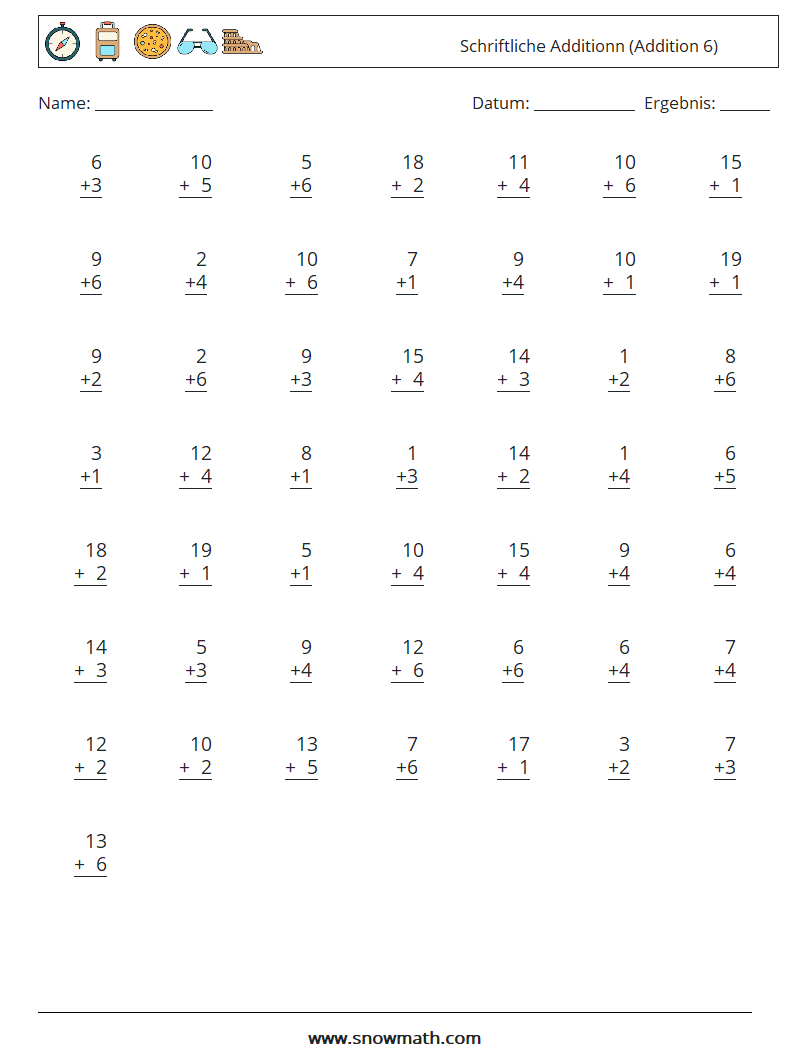 (50 Matheaufgaben) Übe die schriftliche Addition bis 20, addiere 6