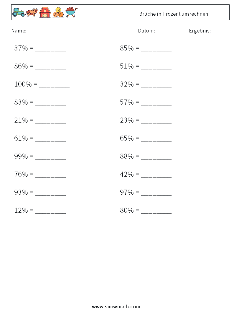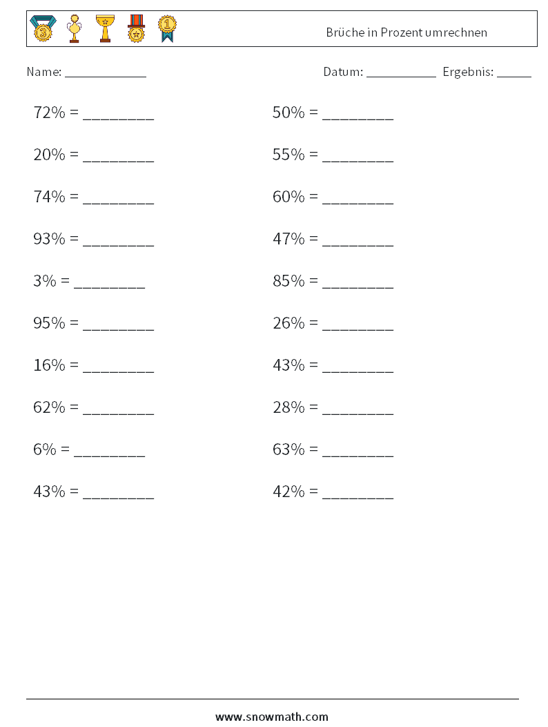 Brüche in Prozent umrechnen Mathe-Arbeitsblätter 3