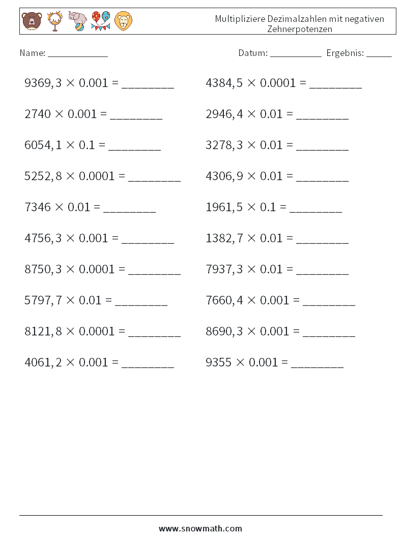 Multipliziere Dezimalzahlen mit negativen Zehnerpotenzen