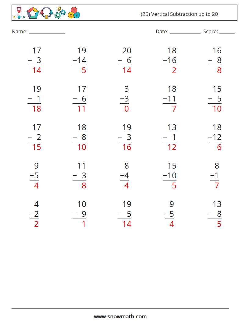 (25) Vertical Subtraction up to 20