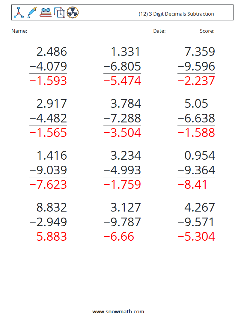 (12) 3 Digit Decimals Subtraction