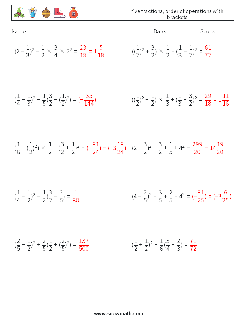 five fractions, order of operations with brackets