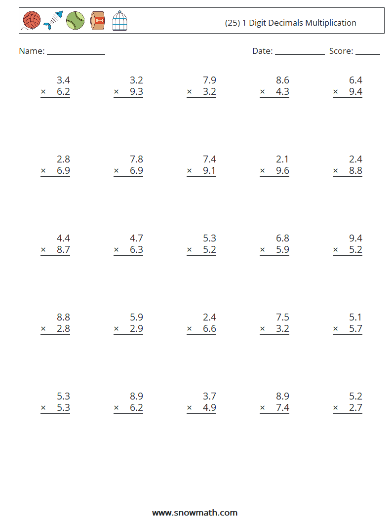 (25) 1 Digit Decimals Multiplication Math Worksheets 6