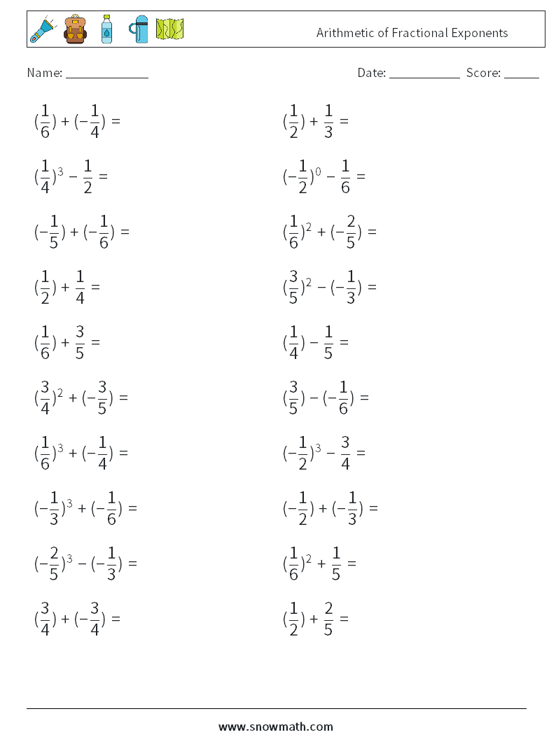 Arithmetic of Fractional Exponents Math Worksheets 1