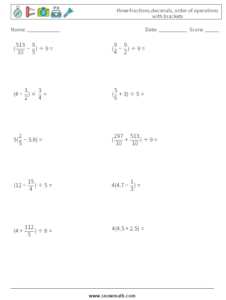 three integers, fractions and decimals, order of operations with brackets. math worksheets.